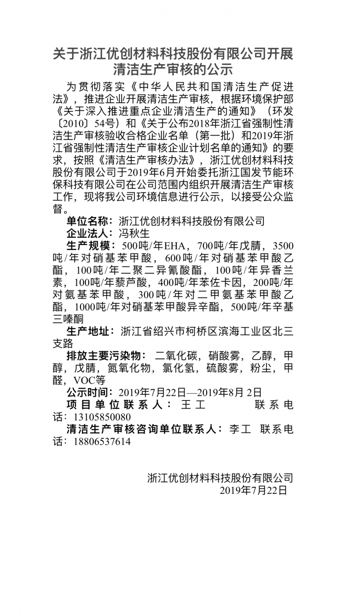 關于浙江優創材料科技股份有限公司開展清潔生產審核的公示